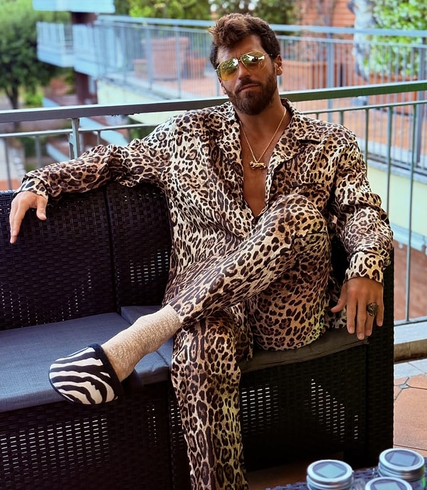 Baştan aşağı leopar desenli bir grup giyen Can Yaman, ne hikmetse, kombinini zebra desenli terliklerle tamamlamaya karar verdi.
