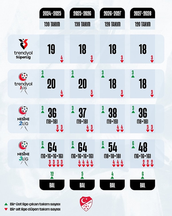 Kulüp gelirlerinin artırılması ve daha güçlü bir rekabet ortamı oluşturulması emeliyle, 2025-2026 döneminde 139 kadronun uğraş edeceği profesyonel liglerdeki grup sayısının kademeli olarak azaltılmasına gidilecektir ve hâlihazırda 139 olan profesyonel ekip sayısı, aşağıdaki görselde dönemlere nazaran belirtilen düşme ve çıkma sayılarına nazaran 120’ye düşürülecektir.’