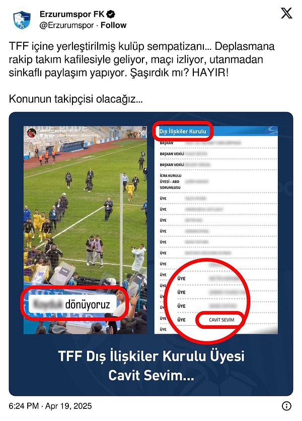 ‘TFF içine yerleştirilmiş kulüp sempatizanı… Deplasmana rakip ekip kafilesiyle geliyor, maçı izliyor, utanmadan sinkaflı paylaşım yapıyor. Şaşırdık mı? HAYIR! Mevzunun takipçisi olacağız…’