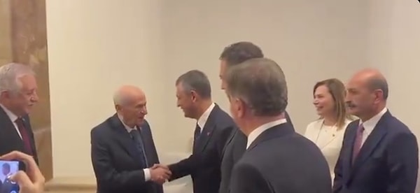 Bahçeli ve Özel tokalaşırken, Bahçeli; ‘Yakından takip ediyorum, çok hareketlisiniz maşallah.’ tabirlerini kullandı. Özel ise “Sağolun” diye karşılık verdi.