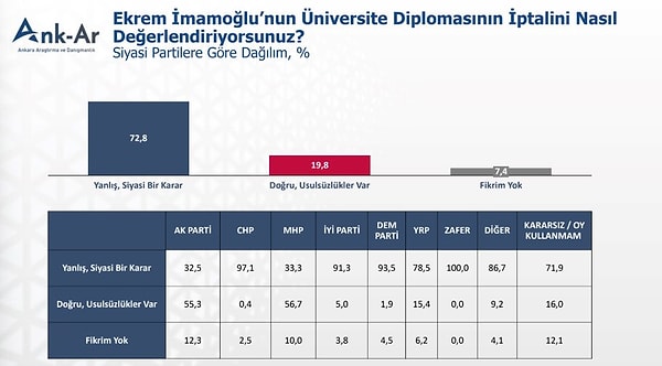 Ekrem İmamoğlu’nun lisans diplomasının iptali konusunda %72.8’lik bir kesim siyasi ve yanlış bir karar diyor.