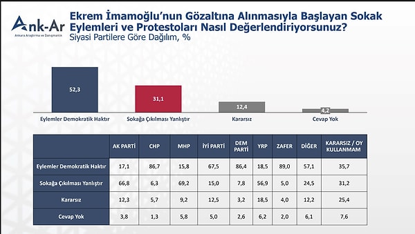 %58.9 kararı yanlış bulduğunu beyan ederken %25.1 hakikat buluyor. Kararsızların %41 oranında tutuklamayı yanlış bulması da dikkat cazibeli bir ayrıntı.