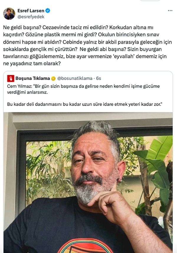 Cem Yılmaz kendisine gelen tenkitleri ‘alıntılayarak’ karşılık verirken daha sonra neden bu türlü davrandığını ima eden bir paylaşım yaptı. Fakat bu paylaşıma beşerler ‘Ne gelmiş olabilir başına?’ diyerek bu süreçte yaşanan hukuksuzlukları hatırlattı. O yansılar de dayanak gördü.