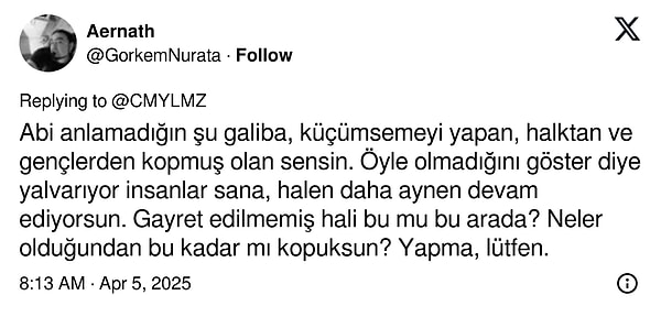 Cem Yılmaz’ın ‘sessiz’ kalışı, 301 öğrencinin tutuklanmasına ses çıkarmaması, polis şiddeti ya da İmamoğlu’nun tutuklanışına dair bir hal almaması oldukça eleştirilmişti. Cem Yılmaz kendisini anlatmak için yaptığı paylaşıma reaksiyon gelince, yansılara reaksiyon çekecek yeni açıklamalar eklemişti. ‘Sen giderken ben dönüyordum’ diyerek kendi sinemalarıyla yaptığı gönderme birinci açıklamasından daha fazla reaksiyon çekmişti.