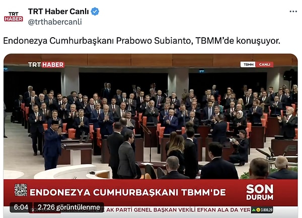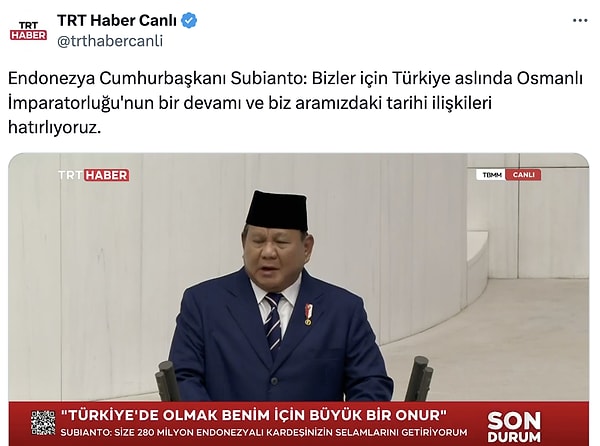Endonezya Cumhurbaşkanı Prabowo Subianto Türkiye’yi ziyaret etti. Cumhurbaşkanı Recep Tayyip Erdoğan tarafından resmi merasimle karşılanan Subianto iki ülke ortasında kimi ticari mutabakatlara imza attı. Kaan Ulusal Muharip Uçak projesine katılmak istediklerini belirtti. Subianto TBMM’yi de ziyaret etti ve konuşmasında Türkiye Endonezya dostluğuna ve bu yakınlığın tarihi kökenlerine değindi. Atatürk ve Fatih Sultan Mehmet’in idolleri olduğunu söylediği ve konutunda bir Atatürk heykelinin olduğunu belirten devlet başkanının bu sözleri TRT Haber tarafından yayınlanmadı.