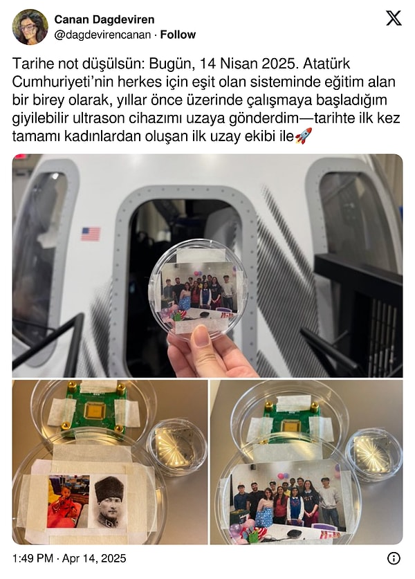 Tarihte birinci sefer tamamı bayanlardan oluşan bir takım uzaya çıktı. Bu uzay seyahatinde tarihi bir an yaşandı. MIT’de çalışan Türk bilim insanı Canan Dağdeviren, göğüs kanserini erken teşhis eden buluşunu Atatürk fotoğrafıyla birlikte uzaya gönderdi. Dağdeviren, ‘İstikbal Göklerdedir’ kelamını hatırlatarak Türkiye Cumhuriyeti’nin kurucusu Atatürk’e dair bir de paylaşımda bulundu.