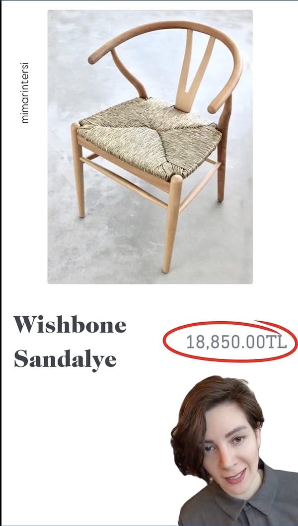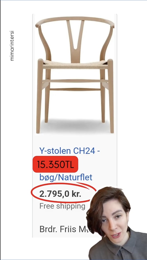 Sandalyenin orijinalinin Danimarka’da TL karşılığı olarak 18.850 TL olduğunu söyleyerek yola çıkıyor mimar.