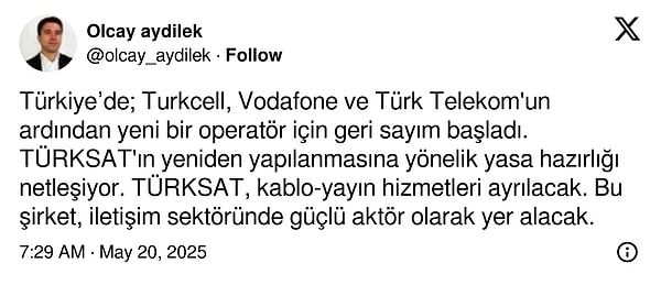 Gazeteci Olcay Aydilek’in tezine nazaran TÜRKSAT’ın GSM operatörü olarak hizmet vermesini sağlayacak yasa taslağı hazırlanmaya başladı.