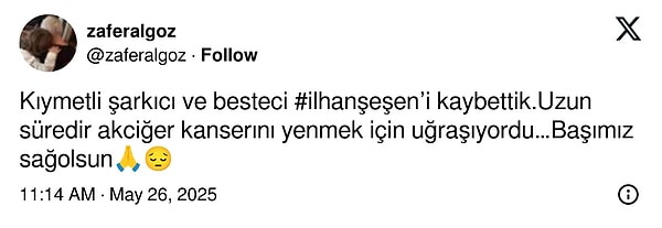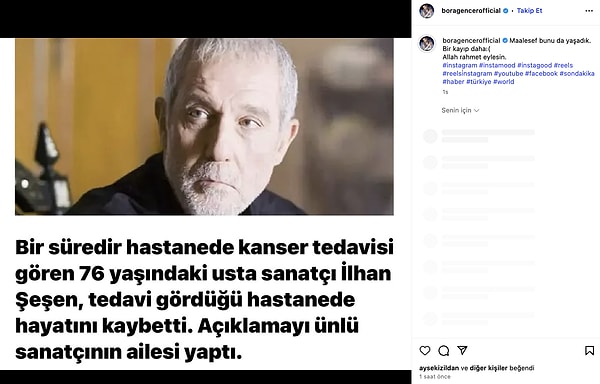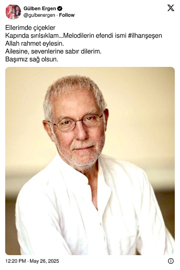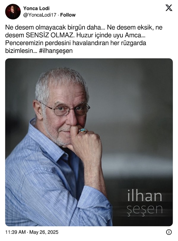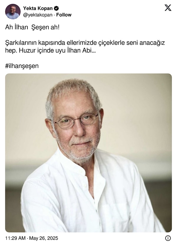 Acı haberi ailesi, ‘Sevgili eşim, canım babamız, biricik dedem İlhan Şeşen’i kaybetmenin derin ıstırabını yaşıyoruz. Tüm sevenlerinin başı sağ olsun.” kelamlarıyla duyurdu.