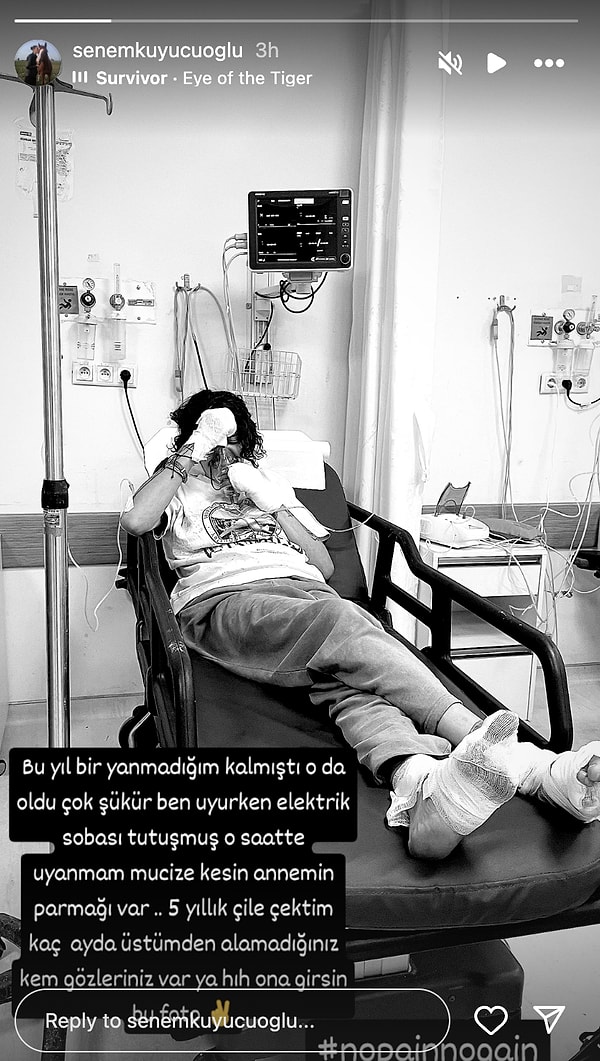“Bu yıl bir yanmadığım kalmıştı o da oldu çok şükür. Ben uyurken elektrik sobası tutuşmuş. O saatte uyanmam mucize. Kesin annemin parmağı var. 5 yıllık sıkıntı çektim, kaç ayda üstümden alamadığınız kem gözleriniz var ya… hıh ona girsin bu foto!”