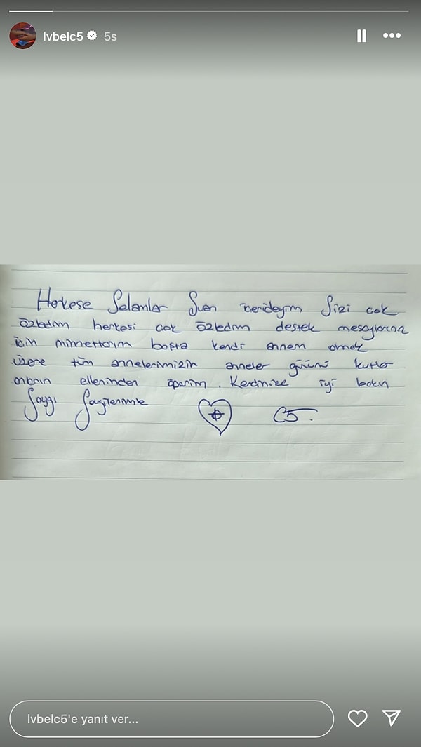 Lvbel C5 mektubunda, ‘Herkese selamlar, şu an içerideyim. Sizi çok özledim, herkesi çok özledim. Takviye iletileriniz için minnettarım. Başta kendi annem olmak üzere tüm annelerimizin Anneler Günü’nü kutlar, onların ellerinden öperim. Kendinize düzgün bakın, hürmet ve sevgilerimle’ tabirlerini kullandı.