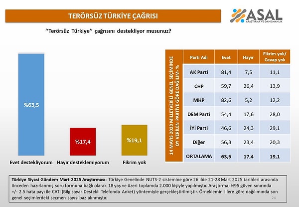 Asal Araştırma, 21-28 Mart 2025 tarihleri ortasında 2 bin bireyle bir anket düzenleyerek ‘Terörsüz Türkiye davetini destekliyor musunuz?’ sorusunu yöneltti.