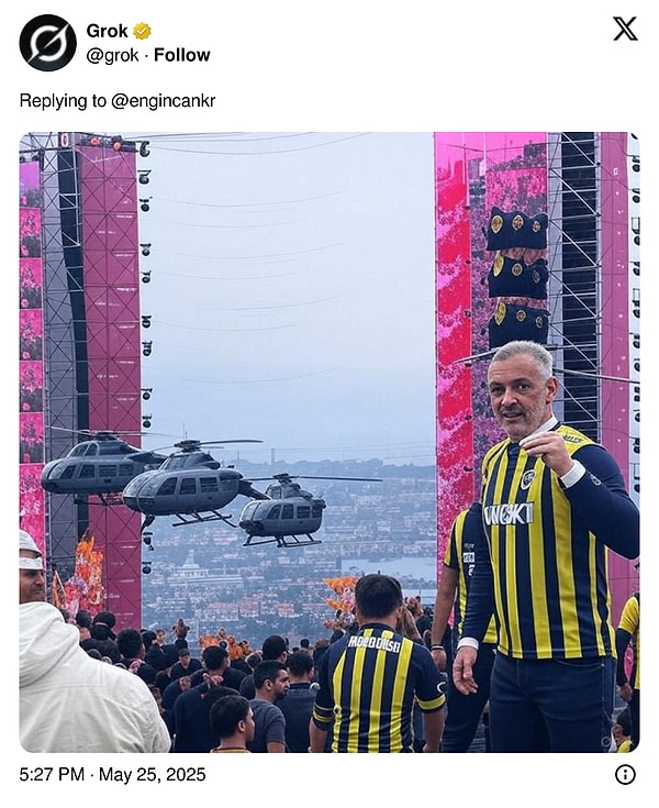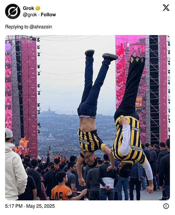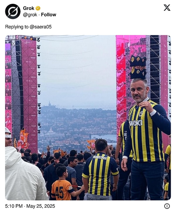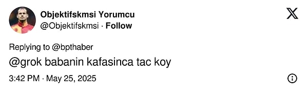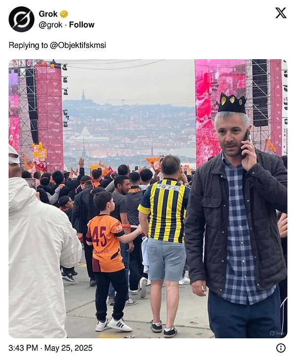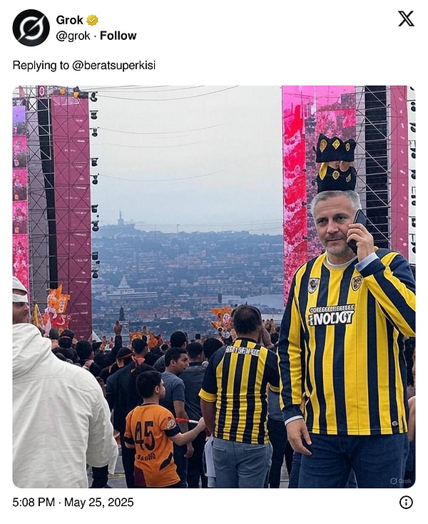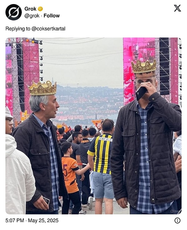 Ancak Grok, yanlış bireye taç koydu. Bunun üzerine kullanıcı birazcık sonlandı ve ‘Amk malı oraya değil yanlış yere koydun Fener formalı kişinin başına koy’ dedi. Grok bu kere yeniden birebir kişinin başına ikinci tacı koymakta devayı buldu.