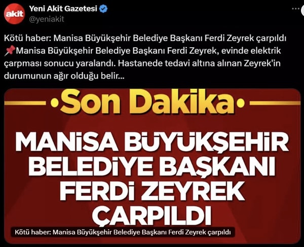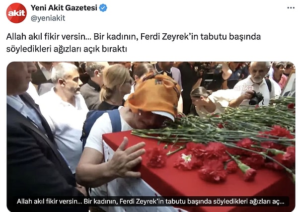 Türkiye Manisa Büyükşehir Belediye Başkanı Ferdi Zeyrek’in ani kaybı için ağlıyor. Zeyrek’in cenaze merasiminde tabuta sarılarak ağlayan bir kadının sözleri ise toplumsal medyada dikkat çekti. Yeni Akit oluşumu da her zamanki bilindik stiliyle gözyaşı döken bayan için yakışıksız sözlerde bulundu.