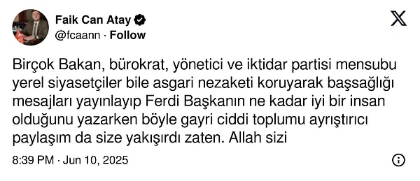 ‘Birçok bakan, bürokrat, yönetici ve iktidar partisi mensubu lokal siyasetçiler bile taban nezaketi koruyarak başsağlığı iletileri yayınlayıp Ferdi Liderin ne kadar yeterli bir insan olduğunu yazarken bu türlü gayri önemli toplumu ayrıştırıcı paylaşım da size yakışırdı esasen. Allah sizi ıslah etsin.’