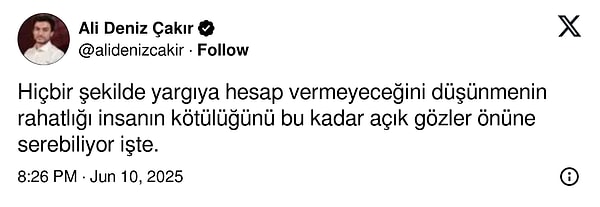 ‘Hiçbir biçimde yargıya hesap vermeyeceğini düşünmenin rahatlığı insanın kötülüğünü bu kadar açık gözler önüne serebiliyor işte.‘