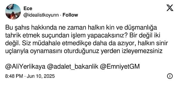 ‘Bu şahıs hakkında ne vakit halkın kin ve düşmanlığa tahrik etmek kabahatinden süreç yapacaksınız? Bir değil iki değil. Siz müdahale etmedikçe daha da azıyor, halkın hudut uçlarıyla oynamasını oturduğunuz yerden izleyemezsiniz‘