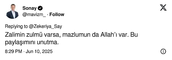 ‘Zalimin zulmü varsa, mazlumun da Allah’ı var. Bu paylaşımını unutma.’