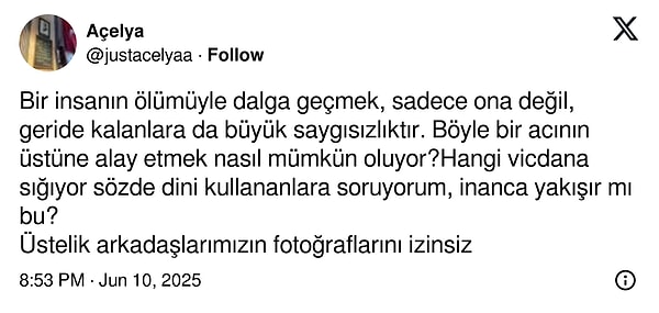 ‘Bir insanın vefatıyla dalga geçmek, yalnızca ona değil, geride kalanlara da büyük saygısızlıktır. Bu türlü bir acının üstüne alay etmek nasıl mümkün oluyor?Hangi vicdana sığıyor kelamda dini kullananlara soruyorum, inanca yakışır mı bu?