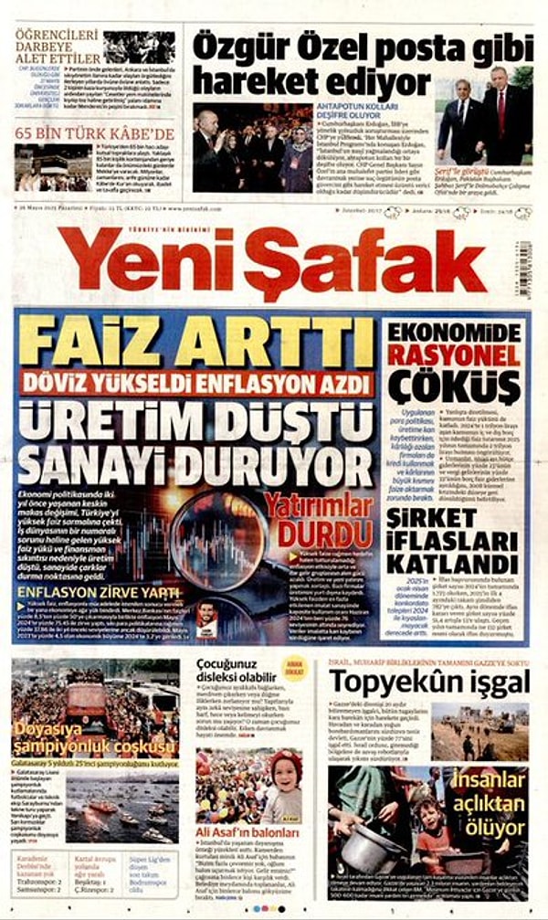 Yeni Şafak evvelki yıllarda olduğu üzere manşetine tekrar iktisat idaresini taşıdı. Daha evvel Merkez Bankası ve bakanlık seviyesinde tenkitleriyle taşları yerinden oynatan Yeni Şafak bir defa daha Mehmet Şimşek’in siyasetlerini amaç aldı.