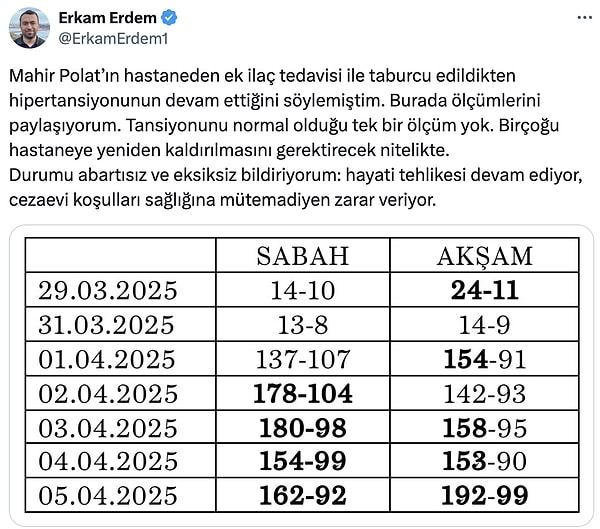 Avukat Erdem, Mahir Polat’ın bir haftalık tansiyon ölçümlerini paylaştı.
