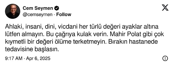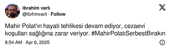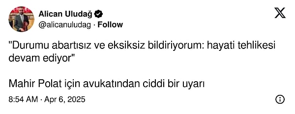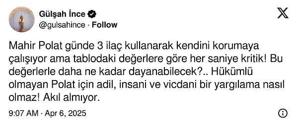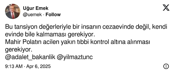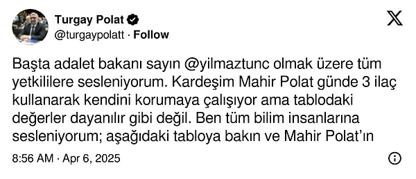 Mahir Polat’ın ağabeyi Turgay Polat ise X hesabından bu ölçümlere Adalet Bakanı Yılmaz Tunç’u etiketleyerek isyan etti. Polat, “Kardeşim Yetenekli Polat günde 3 ilaç kullanarak kendini müdafaaya çalışıyor ancak tablodaki kıymetler dayanılır üzere değil” tabirlerini kullandı.