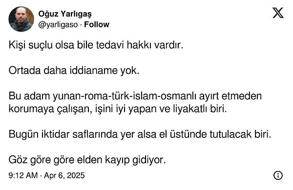İBB’ye başlatılan soruşturma kapsamında 19 Mart’ta gözaltına alınan İBB Genel Sekreter Yardımcısı Uzman Polat, 23 Mart’tan bu yanan Silivri’de tutuklu bulunuyor. Lakin önemli kalp, hipertansiyon ve diyabet hastası olan Polat, tutukluluğundan bu yana iki kere hastaneye kaldırıldı; anjiyo edilip cezaevine tekrar gönderildi. Avukat Erkam Erdem, Polat’ın sıhhatinin giderek berbata gittiğini belirterek tahliyesi için müracaatta bulundu. Fazilet, 5 Nisan Cumartesi günü yaptığı paylaşımda İl Sağlık Kurulu üyelerinin raporuna değinerek ‘Kaybedecek vaktimiz kalmadı’ dedi. Fazilet, paylaşımında şu tabirlere yer verdi: