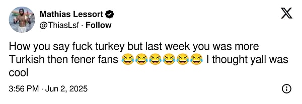 Panathiankos’un yıldızı Lessort X hesabından “Türkiye’ye nasıl küfür ediyorsunuz? Geçen hafta Fenerbahçe taraftarlarından daha Türk’tünüz. Aranız güzel sanıyordum” dedi.
